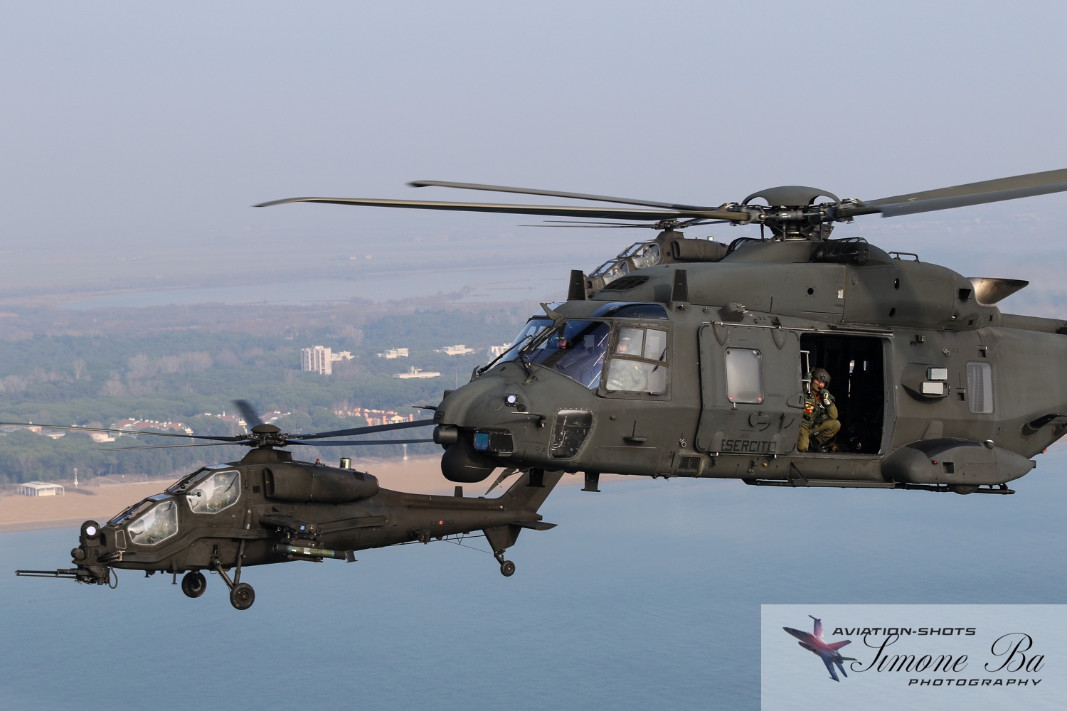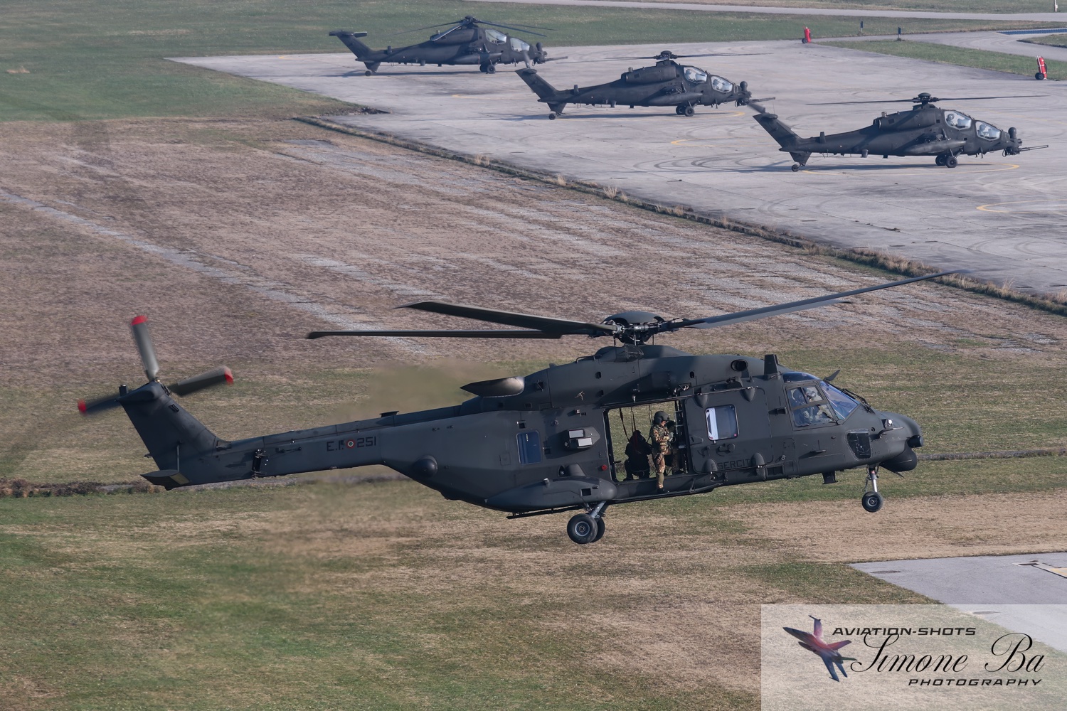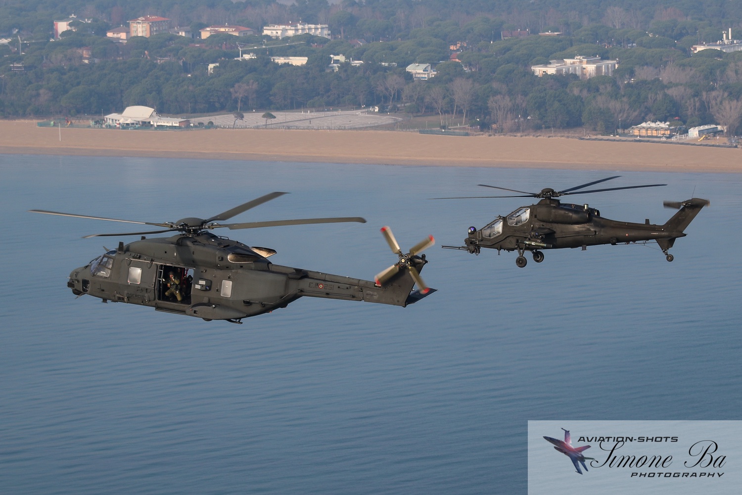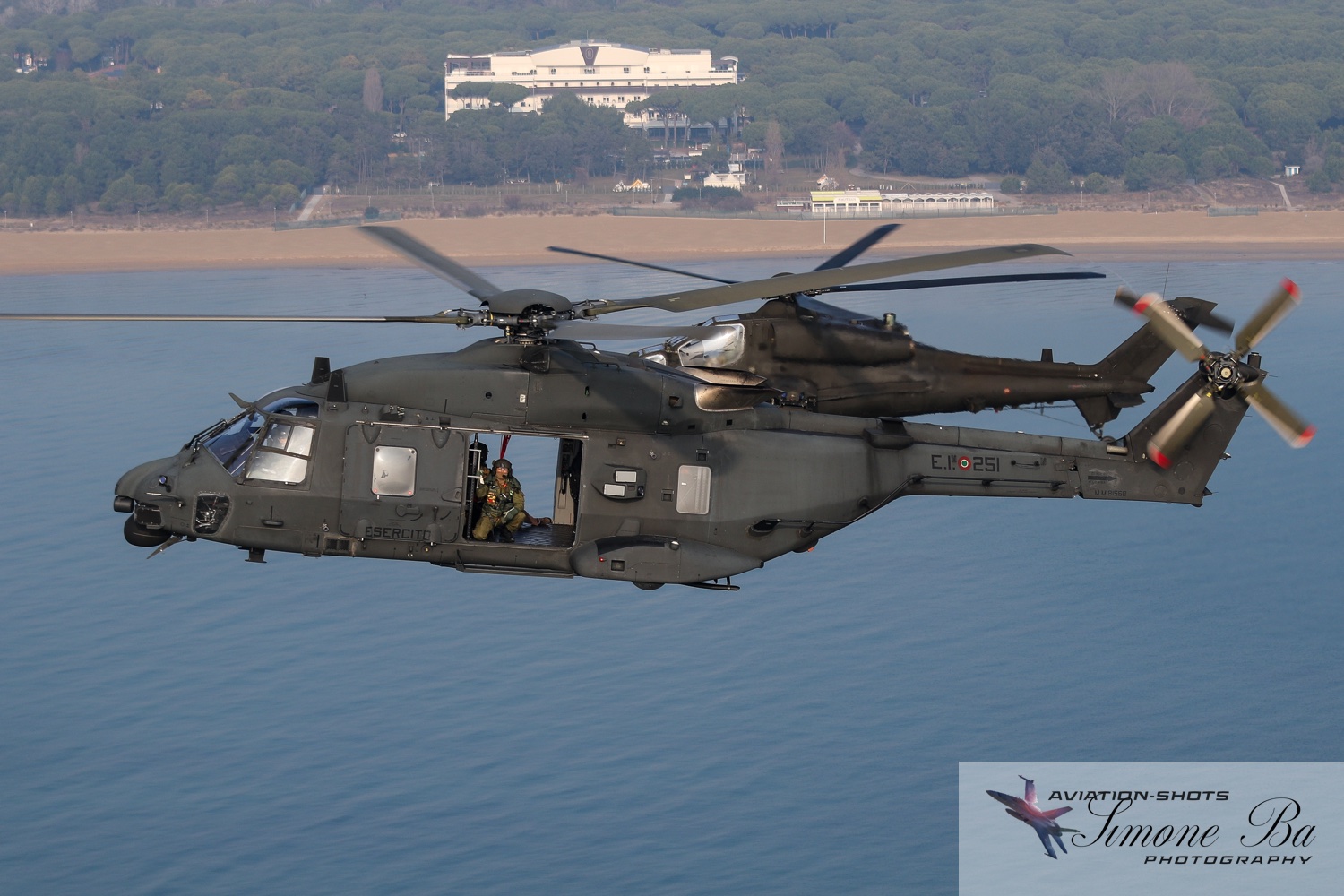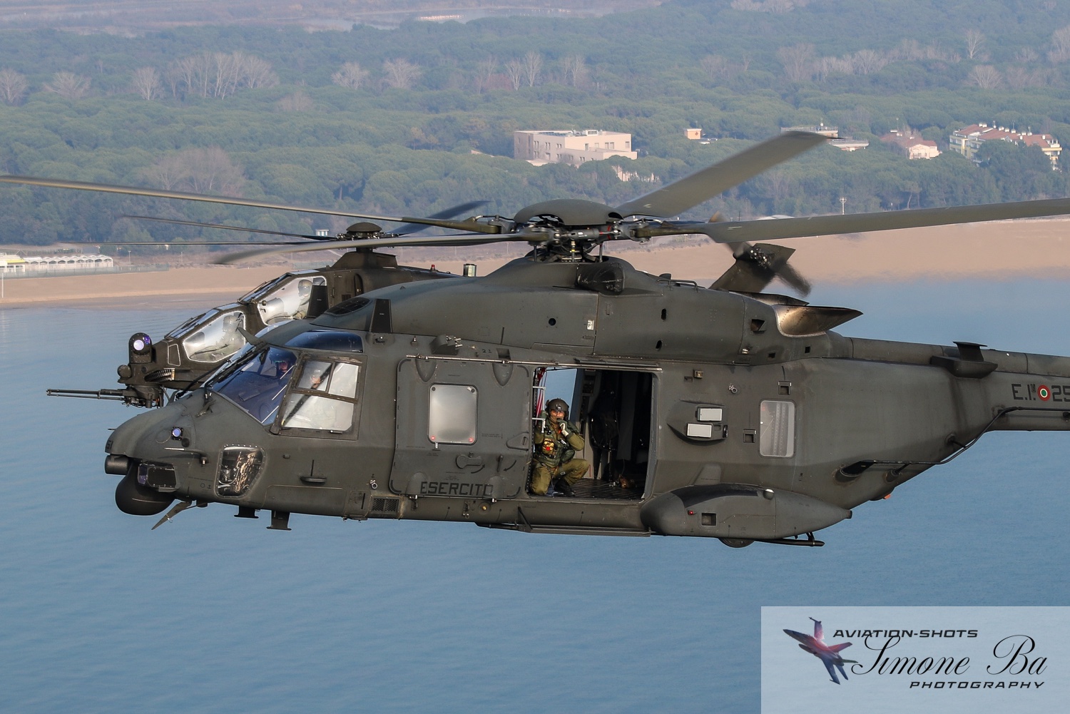 La missione è principalmente incentrata sulle riprese fotografiche in volo degli assetti in dotazione al 27° ed al 49° Gruppi Sqd. AVES. Andremo in volo con quattro elicotteri: due UH-90A e due AH.129D. Ci spostiamo quindi nell’aula briefing del 27° “Mercurio” dove incontriamo gli equipaggi che prenderanno parte alla missione. A condurre il briefing è il Tenente Colonnello W.M., ex pilota e collaudatore di A.129 e pilota di UH-90A. Una volta condivisa la tipologia di foto che vorremmo fare e come posizionare gli elicotteri nelle varie fasi del volo, viene deciso che seguiremo il corso del fiume Tagliamento fino al mare per poi procedere lungo costa fino a Caorle; al rientro seguiremo la stessa rotta dell’andata. Le condizioni metereologiche prevedono nubi sparse con visibilità di qualche chilometro in pianura; sul mare la visibilità dovrebbe migliorare lasciando spazio anche ad un po’ di sole. Terminato il briefing ci rechiamo nell’hangar dove sono custoditi gli equipaggiamenti di volo. Indosseremo una speciale imbragatura con agganciata una fune di colore rosso che verrà fissata al punto di ancoraggio sul tetto dell’elicottero, consentendoci la massima libertà di movimento in tutta sicurezza anche con la rampa posteriore e portelloni laterali aperti. Ci viene accuratamente spiegato come indossarla e regolarla; in particolare ci viene illustrato come liberarci dal cavo di ancoraggio all’elicottero in caso di emergenza: bisogna tirare verso il basso un’apposita maniglia rossa posizionata nella tasca destra del giubbotto. Una volta indossata l’imbragatura saliamo a bordo degli UH-90A; l’operatore di bordo aggancia la fune rossa all’elicottero e la regola in lunghezza sulla base degli spostamenti che dovremmo fare all’interno della cabina. Potremo muoverci liberamente da un portellone all’altro, perché saranno entrambi aperti per tutto il tempo della sessione fotografica. Indosseremo anche delle cuffie con le quali potremo parlare con tutti i membri dell’equipaggio e dare disposizioni su come meglio posizionare la formazione durante il volo. I piloti iniziano la sequenza di accensione dei motori seguendo una check-list che richiede diversi minuti per essere completata. Decolliamo alle 11:30. La formazione composta dai due AH.129D e dai due UH-90A si compatta e si dirige ad est fino a raggiungere il vicino fiume Tagliamento. A questo punto viriamo a sud e l’UH-90A leader si porta davanti alla formazione ed apre il portellone della rampa posteriore per fotografare frontalmente l’altro UH-90A ed i “Mangusta” in diverse posizioni, insieme e singolarmente. Non è una cosa facile perché il calore degli scarichi dei motori dell’UH-90A dal quale si fotografa produce un “haze” che può compromettere la nitidezza delle foto. Una volta raggiunto il mare in prossimità di Lignano Sabbiadoro, la formazione vira verso ovest procedendo lungo la costa in direzione di Caorle. Manteniamo una velocità di 60 nodi ed una quota di 1.000 piedi e non c’è turbolenza. Come previsto, sul mare la visibilità migliora e procediamo ora con le riprese fotografiche dai portelloni laterali. A turno entrambi gli UH-90A fotografano gli AH.129D a distanza ravvicinata, insieme o in coppia. Altri scatti consentono di fotografare insieme i “Mangusta” con uno dei due UH-90A. Una volta a Caorle invertiamo la rotta in direzione di Lignano per un’altra serie di scatti. Proseguiamo poi in direzione dell’aeroporto. Una volta arrivati alla base di Casarsa, l’UH-90A leader si posiziona di traverso sulla testata pista 60 per fotografare gli altri elicotteri della formazione che si abbassano sulla pista dalla direzione opposta. Alle fine tutti gli assetti si portano all’atterraggio sui rispettivi piazzali. La missione si conclude alle 12:30.