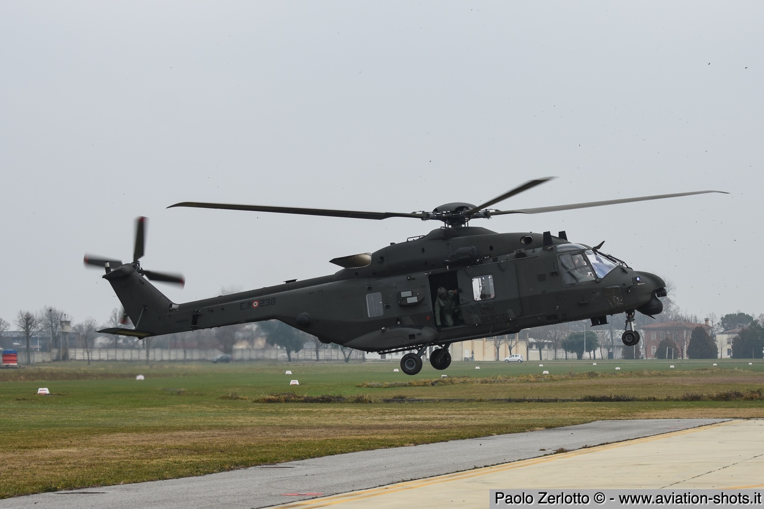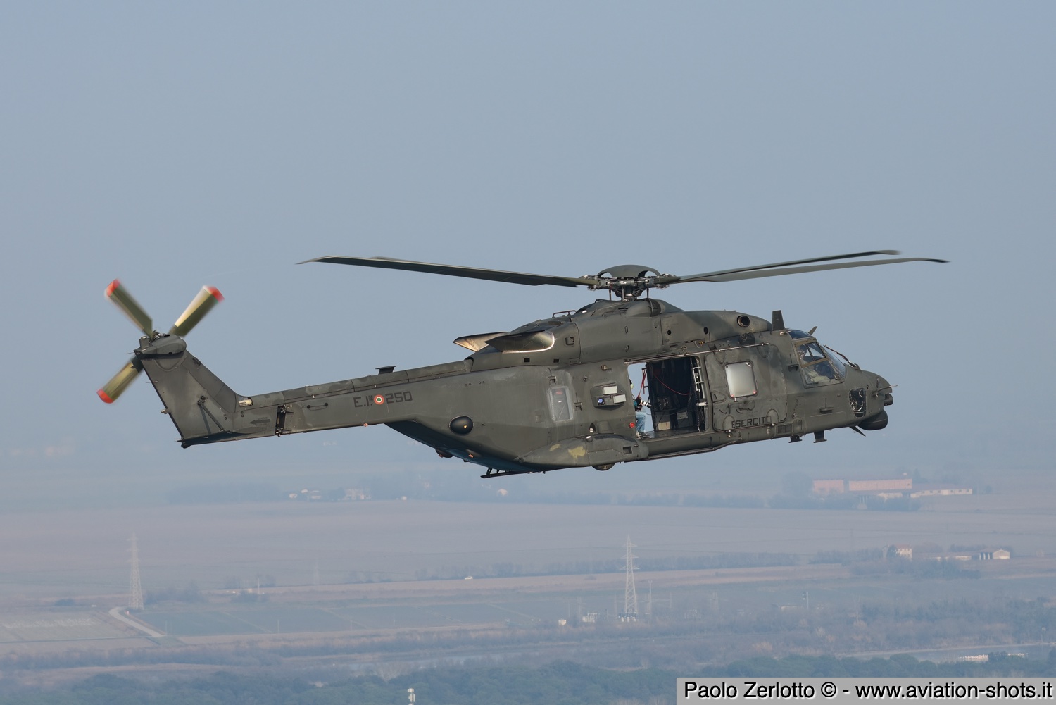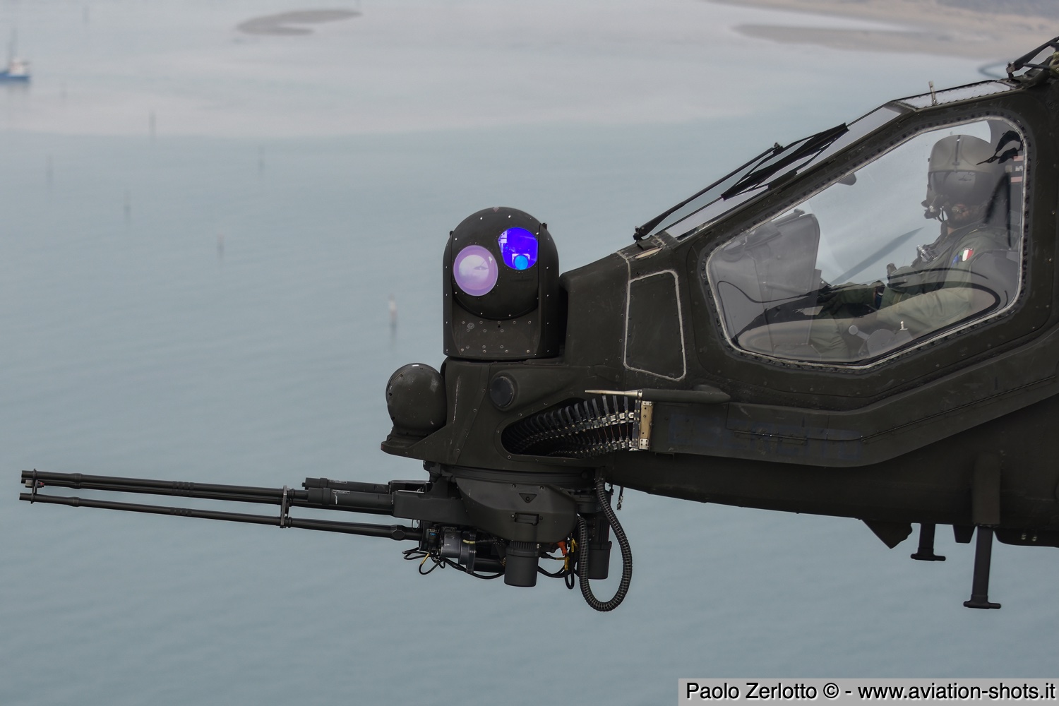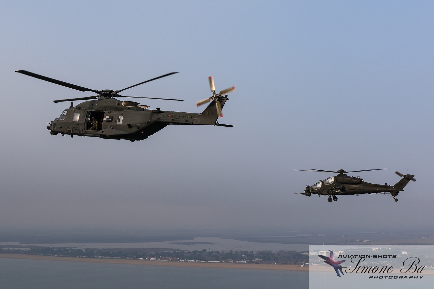 La missione è principalmente incentrata sulle riprese fotografiche in volo degli assetti in dotazione al 27° ed al 49° Gruppi Sqd. AVES. Andremo in volo con quattro elicotteri: due UH-90A e due AH.129D. Ci spostiamo quindi nell’aula briefing del 27° “Mercurio” dove incontriamo gli equipaggi che prenderanno parte alla missione. A condurre il briefing è il Tenente Colonnello W.M., ex pilota e collaudatore di A.129 e pilota di UH-90A. Una volta condivisa la tipologia di foto che vorremmo fare e come posizionare gli elicotteri nelle varie fasi del volo, viene deciso che seguiremo il corso del fiume Tagliamento fino al mare per poi procedere lungo costa fino a Caorle; al rientro seguiremo la stessa rotta dell’andata. Le condizioni metereologiche prevedono nubi sparse con visibilità di qualche chilometro in pianura; sul mare la visibilità dovrebbe migliorare lasciando spazio anche ad un po’ di sole. Terminato il briefing ci rechiamo nell’hangar dove sono custoditi gli equipaggiamenti di volo. Indosseremo una speciale imbragatura con agganciata una fune di colore rosso che verrà fissata al punto di ancoraggio sul tetto dell’elicottero, consentendoci la massima libertà di movimento in tutta sicurezza anche con la rampa posteriore e portelloni laterali aperti. Ci viene accuratamente spiegato come indossarla e regolarla; in particolare ci viene illustrato come liberarci dal cavo di ancoraggio all’elicottero in caso di emergenza: bisogna tirare verso il basso un’apposita maniglia rossa posizionata nella tasca destra del giubbotto. Una volta indossata l’imbragatura saliamo a bordo degli UH-90A; l’operatore di bordo aggancia la fune rossa all’elicottero e la regola in lunghezza sulla base degli spostamenti che dovremmo fare all’interno della cabina. Potremo muoverci liberamente da un portellone all’altro, perché saranno entrambi aperti per tutto il tempo della sessione fotografica. Indosseremo anche delle cuffie con le quali potremo parlare con tutti i membri dell’equipaggio e dare disposizioni su come meglio posizionare la formazione durante il volo. I piloti iniziano la sequenza di accensione dei motori seguendo una check-list che richiede diversi minuti per essere completata. Decolliamo alle 11:30. La formazione composta dai due AH.129D e dai due UH-90A si compatta e si dirige ad est fino a raggiungere il vicino fiume Tagliamento. A questo punto viriamo a sud e l’UH-90A leader si porta davanti alla formazione ed apre il portellone della rampa posteriore per fotografare frontalmente l’altro UH-90A ed i “Mangusta” in diverse posizioni, insieme e singolarmente. Non è una cosa facile perché il calore degli scarichi dei motori dell’UH-90A dal quale si fotografa produce un “haze” che può compromettere la nitidezza delle foto. Una volta raggiunto il mare in prossimità di Lignano Sabbiadoro, la formazione vira verso ovest procedendo lungo la costa in direzione di Caorle. Manteniamo una velocità di 60 nodi ed una quota di 1.000 piedi e non c’è turbolenza. Come previsto, sul mare la visibilità migliora e procediamo ora con le riprese fotografiche dai portelloni laterali. A turno entrambi gli UH-90A fotografano gli AH.129D a distanza ravvicinata, insieme o in coppia. Altri scatti consentono di fotografare insieme i “Mangusta” con uno dei due UH-90A. Una volta a Caorle invertiamo la rotta in direzione di Lignano per un’altra serie di scatti. Proseguiamo poi in direzione dell’aeroporto. Una volta arrivati alla base di Casarsa, l’UH-90A leader si posiziona di traverso sulla testata pista 60 per fotografare gli altri elicotteri della formazione che si abbassano sulla pista dalla direzione opposta. Alle fine tutti gli assetti si portano all’atterraggio sui rispettivi piazzali. La missione si conclude alle 12:30.