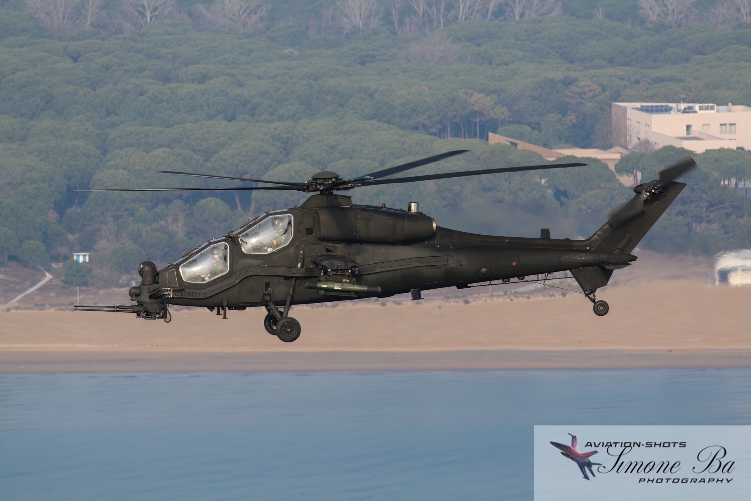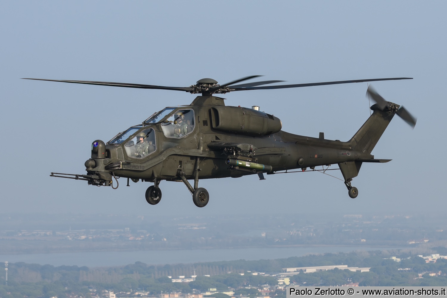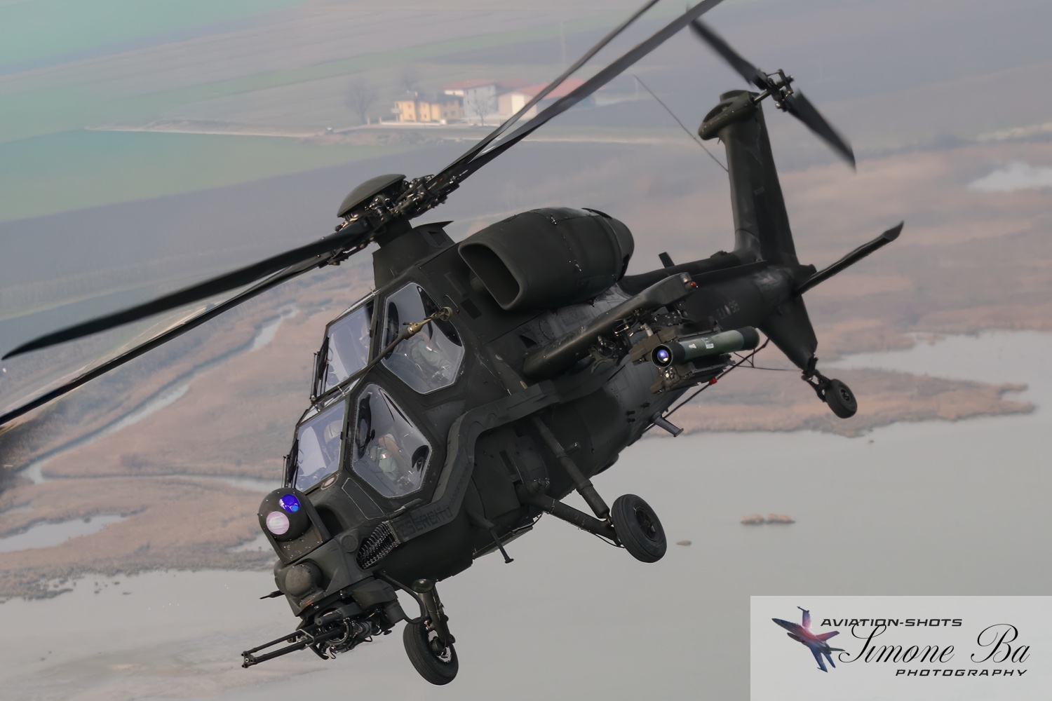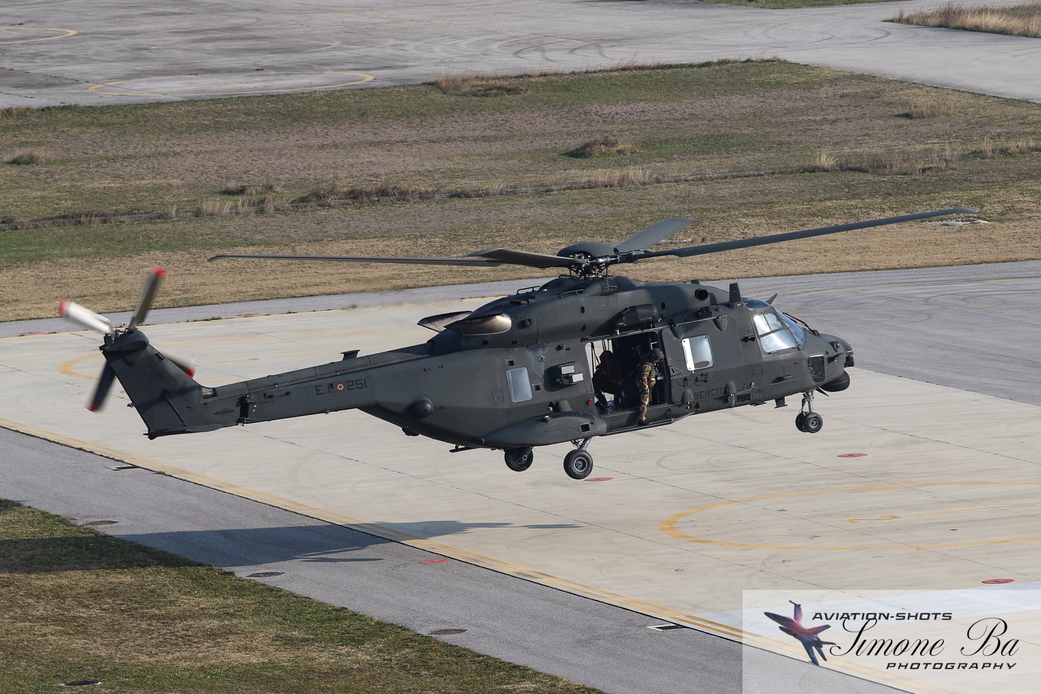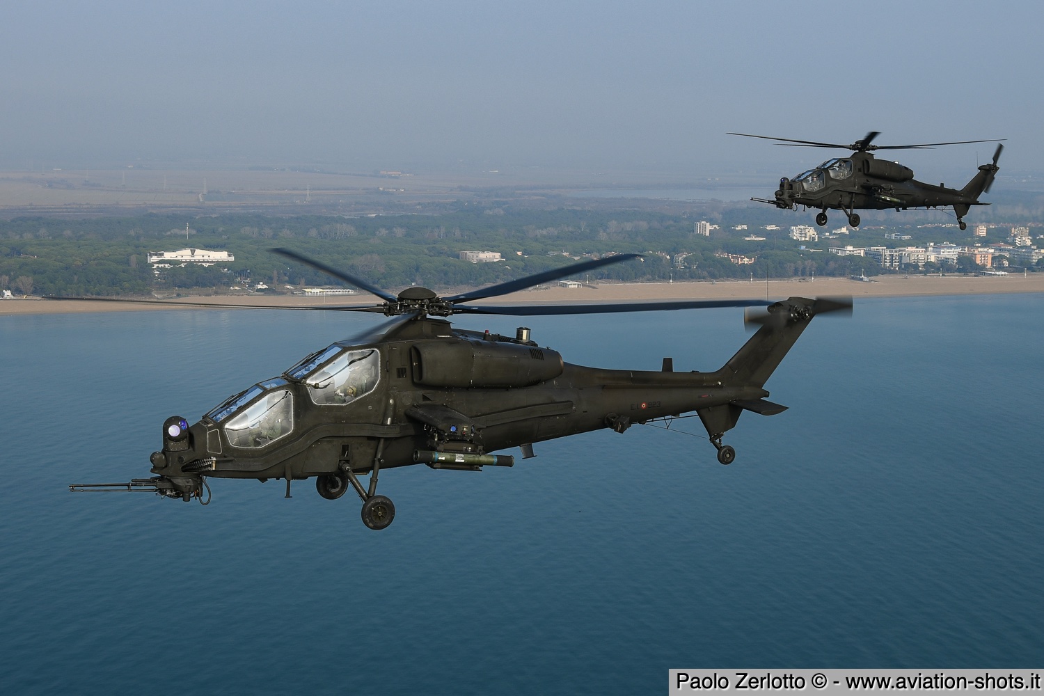 La missione è principalmente incentrata sulle riprese fotografiche in volo degli assetti in dotazione al 27° ed al 49° Gruppi Sqd. AVES. Andremo in volo con quattro elicotteri: due UH-90A e due AH.129D. Ci spostiamo quindi nell’aula briefing del 27° “Mercurio” dove incontriamo gli equipaggi che prenderanno parte alla missione. A condurre il briefing è il Tenente Colonnello W.M., ex pilota e collaudatore di A.129 e pilota di UH-90A. Una volta condivisa la tipologia di foto che vorremmo fare e come posizionare gli elicotteri nelle varie fasi del volo, viene deciso che seguiremo il corso del fiume Tagliamento fino al mare per poi procedere lungo costa fino a Caorle; al rientro seguiremo la stessa rotta dell’andata. Le condizioni metereologiche prevedono nubi sparse con visibilità di qualche chilometro in pianura; sul mare la visibilità dovrebbe migliorare lasciando spazio anche ad un po’ di sole. Terminato il briefing ci rechiamo nell’hangar dove sono custoditi gli equipaggiamenti di volo. Indosseremo una speciale imbragatura con agganciata una fune di colore rosso che verrà fissata al punto di ancoraggio sul tetto dell’elicottero, consentendoci la massima libertà di movimento in tutta sicurezza anche con la rampa posteriore e portelloni laterali aperti. Ci viene accuratamente spiegato come indossarla e regolarla; in particolare ci viene illustrato come liberarci dal cavo di ancoraggio all’elicottero in caso di emergenza: bisogna tirare verso il basso un’apposita maniglia rossa posizionata nella tasca destra del giubbotto. Una volta indossata l’imbragatura saliamo a bordo degli UH-90A; l’operatore di bordo aggancia la fune rossa all’elicottero e la regola in lunghezza sulla base degli spostamenti che dovremmo fare all’interno della cabina. Potremo muoverci liberamente da un portellone all’altro, perché saranno entrambi aperti per tutto il tempo della sessione fotografica. Indosseremo anche delle cuffie con le quali potremo parlare con tutti i membri dell’equipaggio e dare disposizioni su come meglio posizionare la formazione durante il volo. I piloti iniziano la sequenza di accensione dei motori seguendo una check-list che richiede diversi minuti per essere completata. Decolliamo alle 11:30. La formazione composta dai due AH.129D e dai due UH-90A si compatta e si dirige ad est fino a raggiungere il vicino fiume Tagliamento. A questo punto viriamo a sud e l’UH-90A leader si porta davanti alla formazione ed apre il portellone della rampa posteriore per fotografare frontalmente l’altro UH-90A ed i “Mangusta” in diverse posizioni, insieme e singolarmente. Non è una cosa facile perché il calore degli scarichi dei motori dell’UH-90A dal quale si fotografa produce un “haze” che può compromettere la nitidezza delle foto. Una volta raggiunto il mare in prossimità di Lignano Sabbiadoro, la formazione vira verso ovest procedendo lungo la costa in direzione di Caorle. Manteniamo una velocità di 60 nodi ed una quota di 1.000 piedi e non c’è turbolenza. Come previsto, sul mare la visibilità migliora e procediamo ora con le riprese fotografiche dai portelloni laterali. A turno entrambi gli UH-90A fotografano gli AH.129D a distanza ravvicinata, insieme o in coppia. Altri scatti consentono di fotografare insieme i “Mangusta” con uno dei due UH-90A. Una volta a Caorle invertiamo la rotta in direzione di Lignano per un’altra serie di scatti. Proseguiamo poi in direzione dell’aeroporto. Una volta arrivati alla base di Casarsa, l’UH-90A leader si posiziona di traverso sulla testata pista 60 per fotografare gli altri elicotteri della formazione che si abbassano sulla pista dalla direzione opposta. Alle fine tutti gli assetti si portano all’atterraggio sui rispettivi piazzali. La missione si conclude alle 12:30.